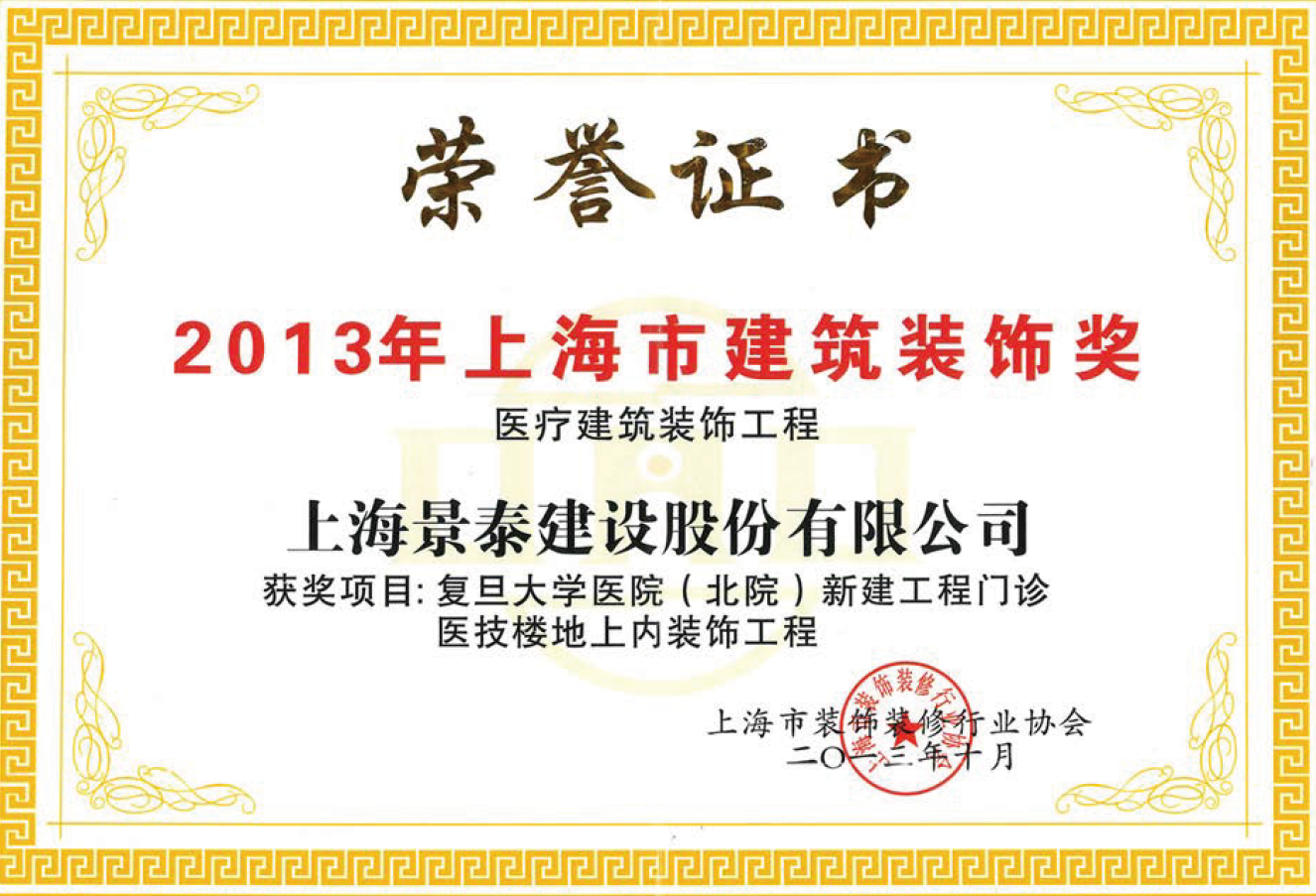 2013年上海市建築裝(zhuāng)飾獎【醫(yī)療建築裝(zhuāng)飾工(gōng)程】 複旦大學(xué)醫(yī)院(北院)新(xīn)建工(gōng)程門診醫(yī)技(jì )樓地上内裝(zhuāng)飾工(gōng)程
