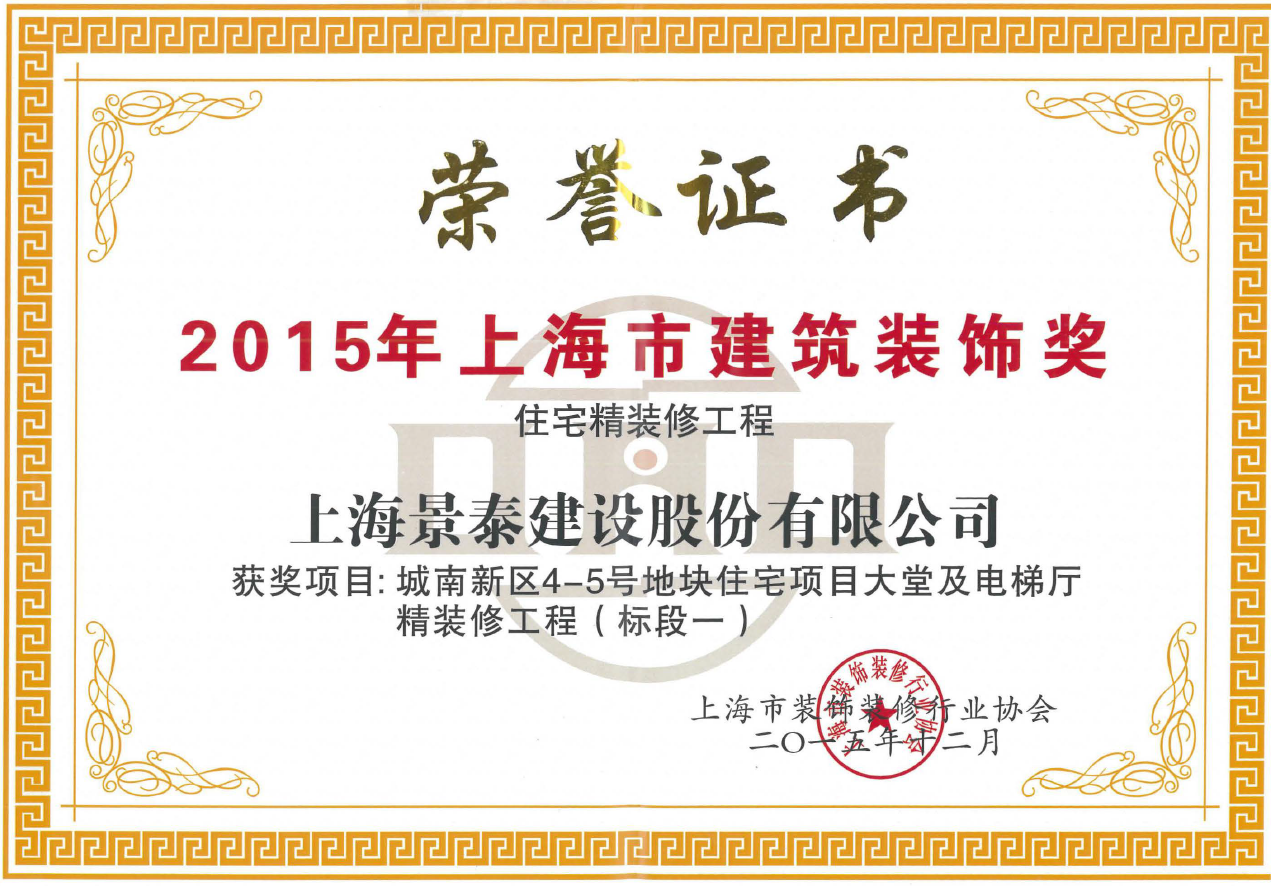 2015年上海市建築裝(zhuāng)飾獎【住宅精(jīng)裝(zhuāng)修工(gōng)程】 城南新(xīn)區(qū)4-5号地塊住宅項目大堂及電(diàn)梯廳精(jīng)裝(zhuāng)修工(gōng)程(标段一)